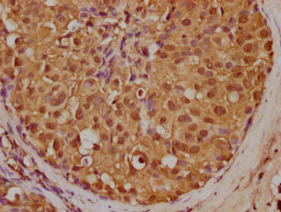 • IHC image of CSB-PA014666LA01HU diluted at 1:200 and staining in paraffin-embedded human breast cancer performed on a Leica BondTM system. After dewaxing and hydration, antigen retrieval was mediated by high pressure in a citrate buffer (pH 6.0). Section was blocked with 10% normal goat serum 30min at RT. Then primary antibody (1% BSA) was incubated at 4°C overnight. The primary is detected by a biotinylated secondary antibody and visualized using an HRP conjugated SP system.