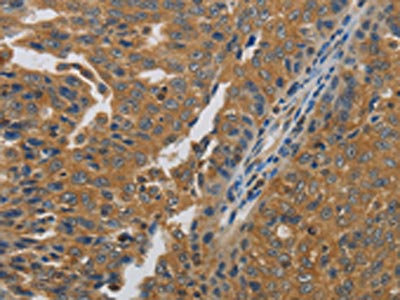 The image on the left is immunohistochemistry of paraffin-embedded Human esophagus cancer tissue using CSB-PA220976(MMP8 Antibody) at dilution 1/45, on the right is treated with synthetic peptide. (Original magnification: ×200)
