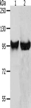 Gel: 8%SDS-PAGE, Lysate: 40 μg, Lane 1-2: HT29 cells, 231 cells, Primary antibody: CSB-PA220976(MMP8 Antibody) at dilution 1/650, Secondary antibody: Goat anti rabbit IgG at 1/8000 dilution, Exposure time: 10 seconds