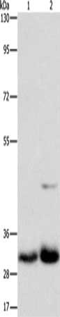 Gel: 8%SDS-PAGE, Lysate: 40 μg, Lane 1-2: Lovo cells, PC3 cells, Primary antibody: CSB-PA658038(MPG Antibody) at dilution 1/950, Secondary antibody: Goat anti rabbit IgG at 1/8000 dilution, Exposure time: 1 minute