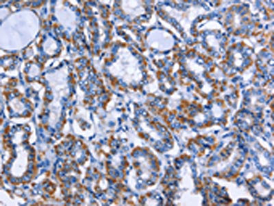 The image on the left is immunohistochemistry of paraffin-embedded Human thyroid cancer tissue using CSB-PA989166(MPO Antibody) at dilution 1/50, on the right is treated with fusion protein. (Original magnification: ×200)