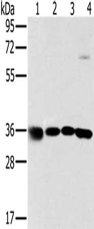 Gel: 8%SDS-PAGE, Lysate: 40 μg, Lane 1-4: 293T cells, K562 cells, 231 cells, hela cells, Primary antibody: CSB-PA795924(MRPL39 Antibody) at dilution 1/600, Secondary antibody: Goat anti rabbit IgG at 1/8000 dilution, Exposure time: 2 seconds