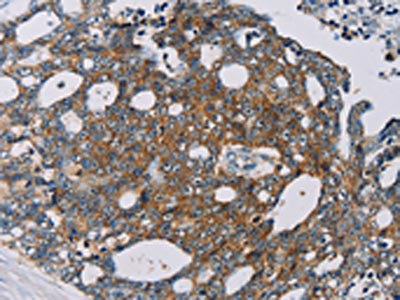 The image on the left is immunohistochemistry of paraffin-embedded Human cervical cancer tissue using CSB-PA223569(MRPL39 Antibody) at dilution 1/30, on the right is treated with fusion protein. (Original magnification: ×200)