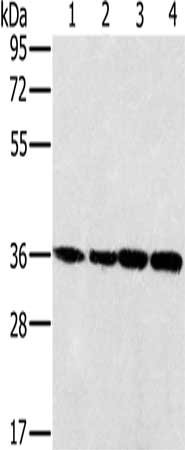 Gel: 8%SDS-PAGE, Lysate: 40 μg, Lane 1-4: 293T cells, K562 cells, 231 cells, hela cells, Primary antibody: CSB-PA223569(MRPL39 Antibody) at dilution 1/400, Secondary antibody: Goat anti rabbit IgG at 1/8000 dilution, Exposure time: 5 seconds