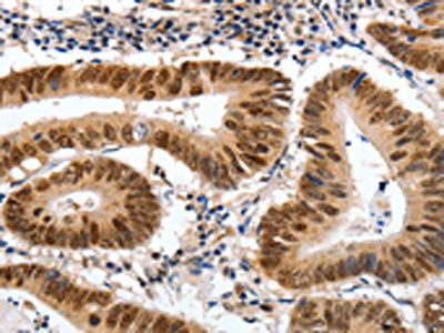 The image on the left is immunohistochemistry of paraffin-embedded Human colon cancer tissue using CSB-PA906808(MSH3 Antibody) at dilution 1/30, on the right is treated with fusion protein. (Original magnification: ×200)