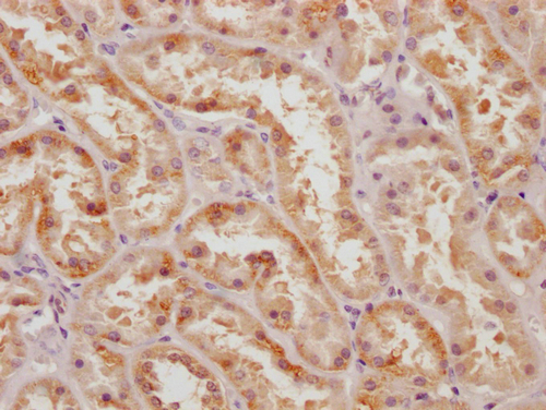 IHC image of CSB-PA896505HA01HU diluted at 1:100 and staining in paraffin-embedded human kidney tissue performed on a Leica BondTM system. After dewaxing and hydration, antigen retrieval was mediated by high pressure in a citrate buffer (pH 6.0). Section was blocked with 10% normal goat serum 30min at RT. Then primary antibody (1% BSA) was incubated at 4°C overnight. The primary is detected by a Goat anti-rabbit polymer IgG labeled by HRP and visualized using 0.05% DAB.