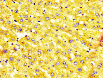 IHC image of CSB-PA015055LA01HU diluted at 1:400 and staining in paraffin-embedded human liver tissue performed on a Leica BondTM system. After dewaxing and hydration, antigen retrieval was mediated by high pressure in a citrate buffer (pH 6.0). Section was blocked with 10% normal goat serum 30min at RT. Then primary antibody (1% BSA) was incubated at 4°C overnight. The primary is detected by a biotinylated secondary antibody and visualized using an HRP conjugated SP system.