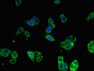 Immunofluorescent analysis of HepG2 cells using CSB-PA015209LA01HU at dilution of 1:100 and Alexa Fluor 488-congugated AffiniPure Goat Anti-Rabbit IgG(H+L)