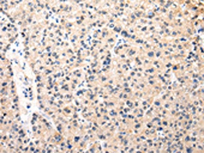 The image on the left is immunohistochemistry of paraffin-embedded Human liver cancer tissue using CSB-PA941558(MUC1(NT) Antibody) at dilution 1/35, on the right is treated with synthetic peptide. (Original magnification: ×200)