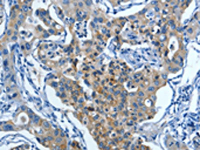 • The image on the left is immunohistochemistry of paraffin-embedded Human lung cancer tissue using CSB-PA113113(MUC15 Antibody) at dilution 1/50, on the right is treated with fusion protein. (Original magnification: ×200)