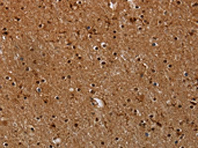 The image on the left is immunohistochemistry of paraffin-embedded Human brain tissue using CSB-PA906238(MYBBP1A Antibody) at dilution 1/40, on the right is treated with synthetic peptide. (Original magnification: ×200)