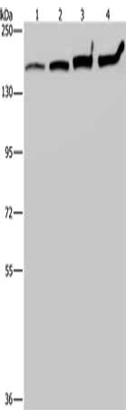 Gel: 6%SDS-PAGE, Lysate: 40 μg, Lane 1-4: HT29 cells, A549 cells, 293T cells, Hela cells, Primary antibody: CSB-PA906238(MYBBP1A Antibody) at dilution 1/200, Secondary antibody: Goat anti rabbit IgG at 1/8000 dilution, Exposure time: 20 seconds