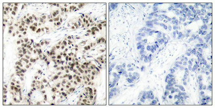 • Immunohistochemical analysis of paraffin-embedded human breast carcinoma tissue using Myc(Ab-58) Antibody(left) or the same antibody preincubated with blocking peptide(right).