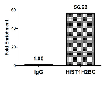• Chromatin Immunoprecipitation Hela (4*106) were treated with Micrococcal Nuclease, sonicated, and immunoprecipitated with 5µg anti-HIST1H2BC (CSB-PA010403OA12me1HU) or a control normal rabbit IgG. The resulting ChIP DNA was quantified using real-time PCR with primers against the β-Globin promoter.