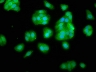 Immunofluorescence staining of HepG2 cells with CSB-PA885699LA01HU at 1:66, counter-stained with DAPI. The cells were fixed in 4% formaldehyde, permeabilized using 0.2% Triton X-100 and blocked in 10% normal Goat Serum. The cells were then incubated with the antibody overnight at 4°C. The secondary antibody was Alexa Fluor 488-congugated AffiniPure Goat Anti-Rabbit IgG(H+L).