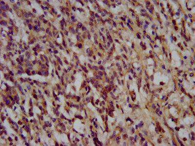 IHC image of CSB-PA885699LA01HU diluted at 1:200 and staining in paraffin-embedded human gastric cancer performed on a Leica BondTM system. After dewaxing and hydration, antigen retrieval was mediated by high pressure in a citrate buffer (pH 6.0). Section was blocked with 10% normal goat serum 30min at RT. Then primary antibody (1% BSA) was incubated at 4°C overnight. The primary is detected by a biotinylated secondary antibody and visualized using an HRP conjugated SP system.