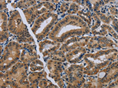 The image on the left is immunohistochemistry of paraffin-embedded Human thyroid cancer tissue using CSB-PA088333(NAT10 Antibody) at dilution 1/40, on the right is treated with fusion protein. (Original magnification: ×200)