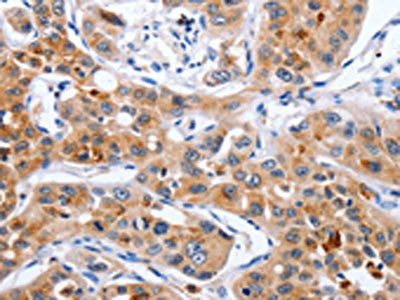 The image on the left is immunohistochemistry of paraffin-embedded Human lung cancer tissue using CSB-PA051391(NCK1 Antibody) at dilution 1/30, on the right is treated with fusion protein. (Original magnification: ×200)