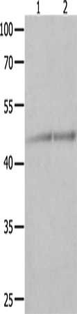 Gel: 10%SDS-PAGE, Lysate: 40 μg, Lane 1-2: Jurkat cells, K562 cells, Primary antibody: CSB-PA051391(NCK1 Antibody) at dilution 1/600, Secondary antibody: Goat anti rabbit IgG at 1/8000 dilution, Exposure time: 1 minute