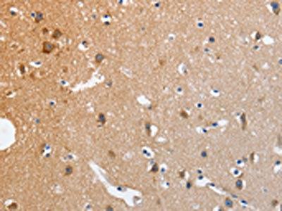 The image on the left is immunohistochemistry of paraffin-embedded Human brain tissue using CSB-PA056855(NCK1 Antibody) at dilution 1/20, on the right is treated with fusion protein. (Original magnification: ×200)