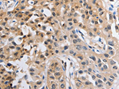 The image on the left is immunohistochemistry of paraffin-embedded Human lung cancer tissue using CSB-PA056855(NCK1 Antibody) at dilution 1/20, on the right is treated with fusion protein. (Original magnification: ×200)