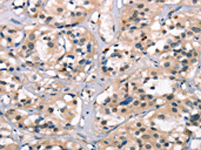 The image on the left is immunohistochemistry of paraffin-embedded Human thyroid cancer tissue using CSB-PA977374(NDNL2 Antibody) at dilution 1/40, on the right is treated with synthetic peptide. (Original magnification: ×200)