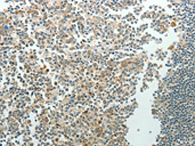 The image on the left is immunohistochemistry of paraffin-embedded Human tonsil tissue using CSB-PA231152(NDRG3 Antibody) at dilution 1/70, on the right is treated with synthetic peptide. (Original magnification: ×200)