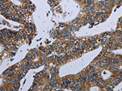 The image on the left is immunohistochemistry of paraffin-embedded Human colon cancer tissue using CSB-PA231615(NDUFA13 Antibody) at dilution 1/40, on the right is treated with fusion protein. (Original magnification: ×200)