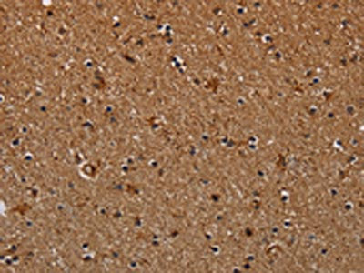 The image on the left is immunohistochemistry of paraffin-embedded Human brain tissue using CSB-PA583070(NDUFAB1 Antibody) at dilution 1/40, on the right is treated with synthetic peptide. (Original magnification: ×200)