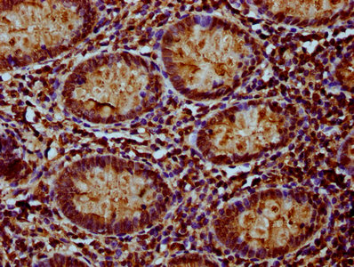 IHC image of CSB-PA880103LA01HU diluted at 1:100 and staining in paraffin-embedded human appendix tissue performed on a Leica BondTM system. After dewaxing and hydration, antigen retrieval was mediated by high pressure in a citrate buffer (pH 6.0). Section was blocked with 10% normal goat serum 30min at RT. Then primary antibody (1% BSA) was incubated at 4°C overnight. The primary is detected by a biotinylated secondary antibody and visualized using an HRP conjugated SP system.