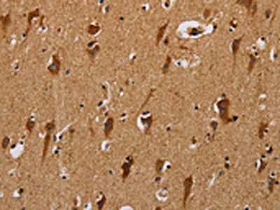 The image on the left is immunohistochemistry of paraffin-embedded Human brain tissue using CSB-PA725678(NDUFS3 Antibody) at dilution 1/40, on the right is treated with fusion protein. (Original magnification: ×200)