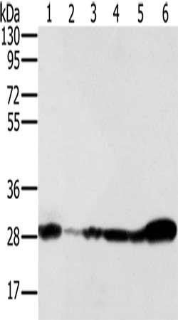 Gel: 8%SDS-PAGE, Lysate: 40 μg, Lane 1-6: 293T cells, NIH/3T3 cells, Raw264.7 cells, hela cells, human fetal brain tissue, mouse brain tissue, Primary antibody: CSB-PA725678(NDUFS3 Antibody) at dilution 1/350, Secondary antibody: Goat anti rabbit IgG at 1/8000 dilution, Exposure time: 5 seconds