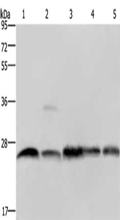 • Gel: 10%SDS-PAGE, Lysate: 40 μg, Lane 1-5: A549 cells, Jurkat cells, mouse heart tissue, mouse skeletal muscle tissue, Raw264.7 cells, Primary antibody: CSB-PA114840(NDUFV2 Antibody) at dilution 1/200, Secondary antibody: Goat anti rabbit IgG at 1/8000 dilution, Exposure time: 5 seconds