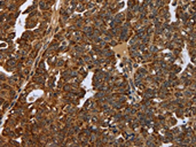 The image on the left is immunohistochemistry of paraffin-embedded Human colon cancer tissue using CSB-PA111065(NEFH Antibody) at dilution 1/40, on the right is treated with synthetic peptide. (Original magnification: ×200)