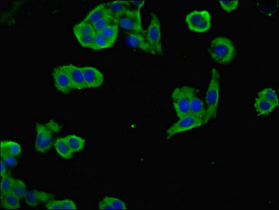 Immunofluorescent analysis of PC-3 cells using CSB-PA015692LA01HU at dilution of 1:100 and Alexa Fluor 488-congugated AffiniPure Goat Anti-Rabbit IgG(H+L)