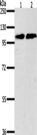 • Gel: 8%SDS-PAGE, Lysate: 40 μg, Lane 1-2: NIH/3T3 cells, Jurkat cells, Primary antibody: CSB-PA042330(NFATC4 Antibody) at dilution 1/400, Secondary antibody: Goat anti rabbit IgG at 1/8000 dilution, Exposure time: 5 seconds