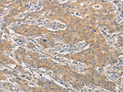 The image on the left is immunohistochemistry of paraffin-embedded Human liver cancer tissue using CSB-PA043937(NFE2L1 Antibody) at dilution 1/30, on the right is treated with fusion protein. (Original magnification: ×200)