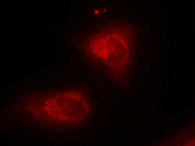 Immunofluorescence staining of methanol-fixed Hela cells using IkB-a(Ab-32/36) Antibody.