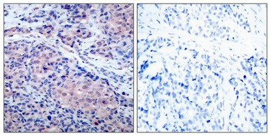 Immunohistochemical analysis of paraffin-embedded human breast carcinoma tissue using IkB-a(Ab-32/36) Antibody(left) or the same antibody preincubated with blocking peptide(right).