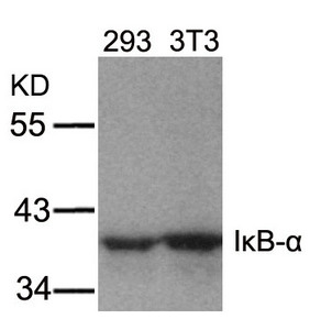 Western blot analysis of extracts from 293 and 3T3 cells using IkB-a(Ab-32/36) Antibody.