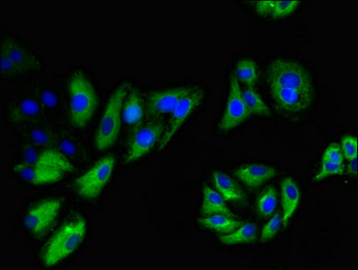Immunofluorescent analysis of HepG2 cells using CSB-PA856441LA01HU at dilution of 1:100 and Alexa Fluor 488-congugated AffiniPure Goat Anti-Rabbit IgG(H+L)