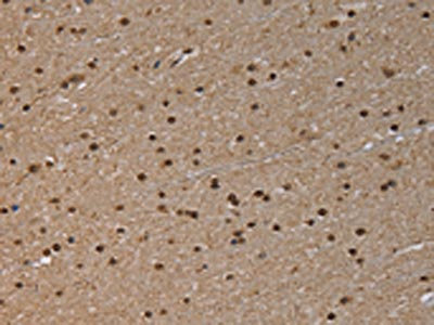 • The image on the left is immunohistochemistry of paraffin-embedded Human brain tissue using CSB-PA727351(NLRP6 Antibody) at dilution 1/50, on the right is treated with synthetic peptide. (Original magnification: ×200)