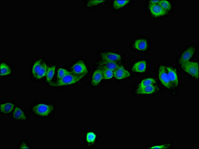 • Immunofluorescent analysis of HepG2 cells using CSB-PA015906LA01HU at dilution of 1:100 and Alexa Fluor 488-congugated AffiniPure Goat Anti-Rabbit IgG(H+L)
