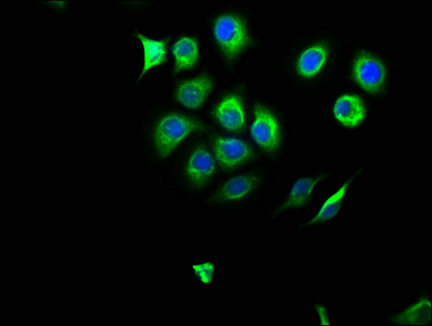 • Immunofluorescence staining of A549 cells with CSB-PA015943LA01HU at 1:166, counter-stained with DAPI. The cells were fixed in 4% formaldehyde, permeabilized using 0.2% Triton X-100 and blocked in 10% normal Goat Serum. The cells were then incubated with the antibody overnight at 4°C. The secondary antibody was Alexa Fluor 488-congugated AffiniPure Goat Anti-Rabbit IgG(H+L).