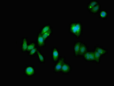 • Immunofluorescent analysis of HepG2 cells using CSB-PA015949LA01HU at dilution of 1:100 and Alexa Fluor 488-congugated AffiniPure Goat Anti-Rabbit IgG(H+L)