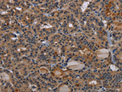 • The image on the left is immunohistochemistry of paraffin-embedded Human thyroid cancer tissue using CSB-PA062668(NPRL2 Antibody) at dilution 1/50, on the right is treated with synthetic peptide. (Original magnification: ×200)