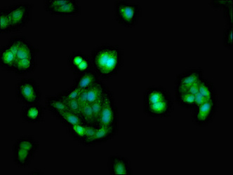 Immunofluorescent analysis of HepG2 cells using CSB-PA016059LA01HU at dilution of 1:100 and Alexa Fluor 488-congugated AffiniPure Goat Anti-Rabbit IgG(H+L)
