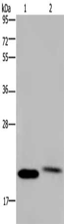 • Gel: 10%SDS-PAGE, Lysate: 40 μg, Lane 1-2: Human fetal brain tissue, Jurkat cells, Primary antibody: CSB-PA981790(NRAS Antibody) at dilution 1/200, Secondary antibody: Goat anti rabbit IgG at 1/8000 dilution, Exposure time: 10 minutes