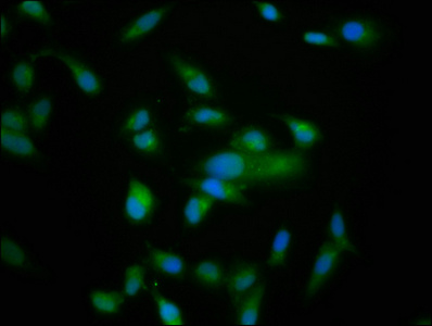 • Immunofluorescence staining of Hela cells with CSB-PA016075LA01HU at 1:166, counter-stained with DAPI. The cells were fixed in 4% formaldehyde, permeabilized using 0.2% Triton X-100 and blocked in 10% normal Goat Serum. The cells were then incubated with the antibody overnight at 4°C. The secondary antibody was Alexa Fluor 488-congugated AffiniPure Goat Anti-Rabbit IgG(H+L).