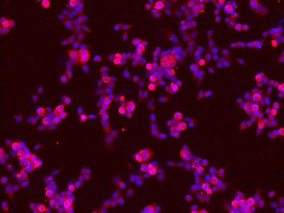 • Immunofluorescence staining of methanol-fixed NCI-h446 cells showing cytoplasmic staining using TrkB (Ab-705) Antibody.